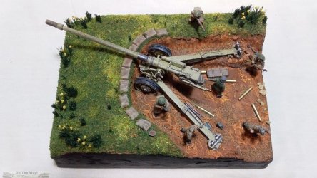 | The Kanone 81/2 is by Ace with an AB miniatures crew (from a POW set). The British figure pointing his hand is from the same set, while the other two are by PSC. Ammunition for the real K81/2 was two part but came as one piece in the kit. I left it that way because I like the look of big shiny "bullets". I made the Daffodils from electrical wire and slices of plastic insulation stripped from the wire, with some shop bought "reeds" for the leaves. Other bits came from the spares box. |