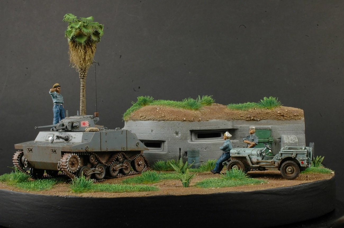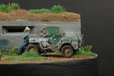 | Olivier used the Dragon Ka-mi and Jeep, with decals from an old Academy GMC. The US Navy sailors are from Hecker & Goros. The bunker is from Italeri. |