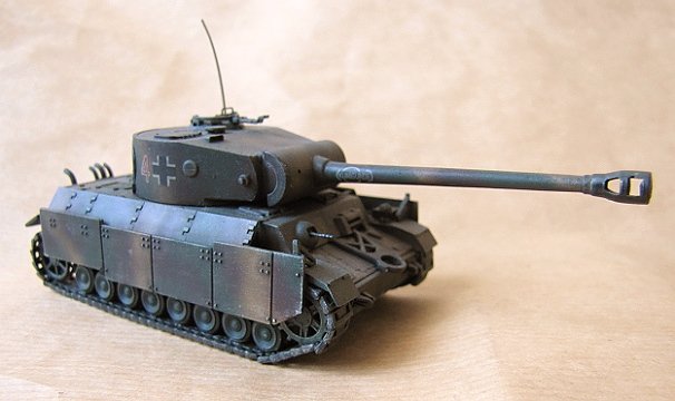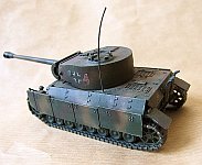 In true life the model is a "German" tank that never was and never could have been either. I am not at all sure if the 122mm gun would have fit the Tiger turret, and it is certain that Panzer IV chassis could not have housed that wide and heavy turret let alone move about with such enormous, front-heavy weight. What you really see here is a fun project to take advantage of a pile of left over and spare kit parts that were lying around after more serious projects. It consists of a PST 122mm gun housed in a Revell late Tiger E turret with a Panther mantlet, and then attached to a Revell Panzer IV chassis with Revell StuG IV wheels and tracks. The hull front panel belongs to a Tiger and is tilted to an abnormally steep angle. Extra armor includes side plates from a Revell Panther and a Matchbox Jagdpanzer. The exhaust set belongs to a Revell Panther and the gun travel lock is taken from an old Matchbox U.S. howitzer. This entertainment project was a fun build with very relaxed authenticity standards and included no serious background study whatsoever. Despite the practical and historical impossibilities I personally like the looks of this little monster, which to me resembles somewhat a T-34/85 blown out of proportion.