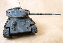 In WW II the Finnish army captured amongst other equipment a total of seven Soviet T-34/85 tanks intact, which proved to be an important addition to the anti-tank equipment of the field army. All of them were successfully operated against their former owners by the 2nd company of the Tank Brigade "Lagus" on the Karelian Isthmus in 1944 and after the armistice in Lapland against Germans. Surviving vehicles of this type were removed from active service in 1962. This model represents the company command vehicle (Ps. 245-5) painted in the scheme of summer of 1944. The model is the fabulous new Revell kit, which is slightly changed to resemble the original, earlier type vehicle by cutting off the fender ends, changing the outer hull equipment a bit and enhancing the turret cast seams with stretched and sanded down sprue. The cast appearance of the turret is enhanced by softening the surface with liquid glue and then pressing the texture on with an old toothbrush. Some details are added (turret lift hooks, additional hull stowage hooks, support bars for spare fuel tank racks, track log, headlight cord, antenna). The national insignias and serial numbers are self made. The error with these is that the small serial numbers should be white instead of black. Altogether, this is one of the nicest kits that I have built, but there is one very annoying mistake, which is that there the track measurement is wrong, like many other fellow modellers have noticed. This leaves a narrow gap somewhere at the length of both tracks, which needs to be filled somehow. |