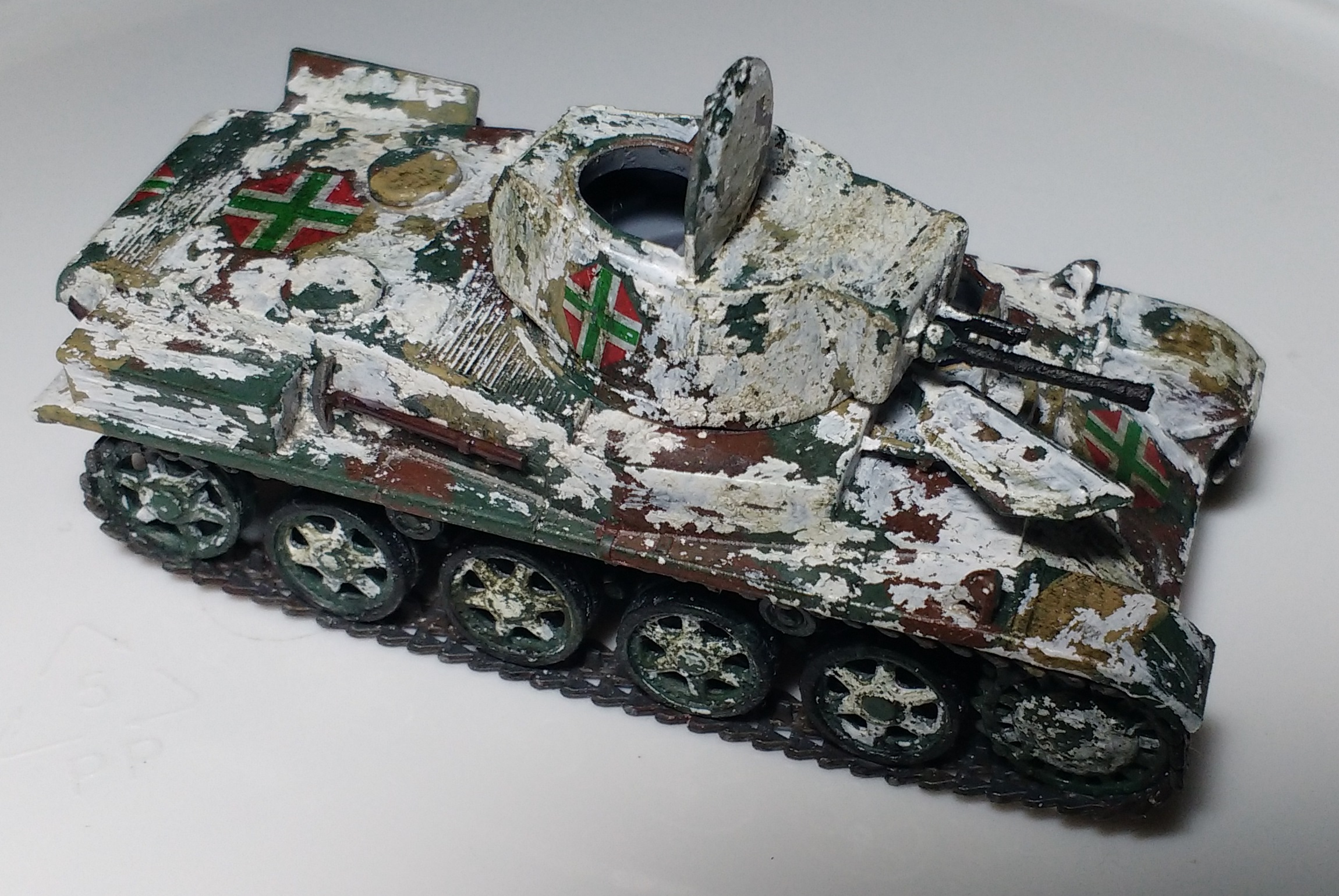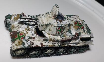 The model was painted in a 3-tone camouflage, then recived some late-autumn weathering. Winter camouflage was not very durable, so I made a heavy chipping effect (Ammo-Mig Jimenez Heavy Chipping Effects + XF-2 Tamiya). A single photo shows a white painted tank before it was scratched.