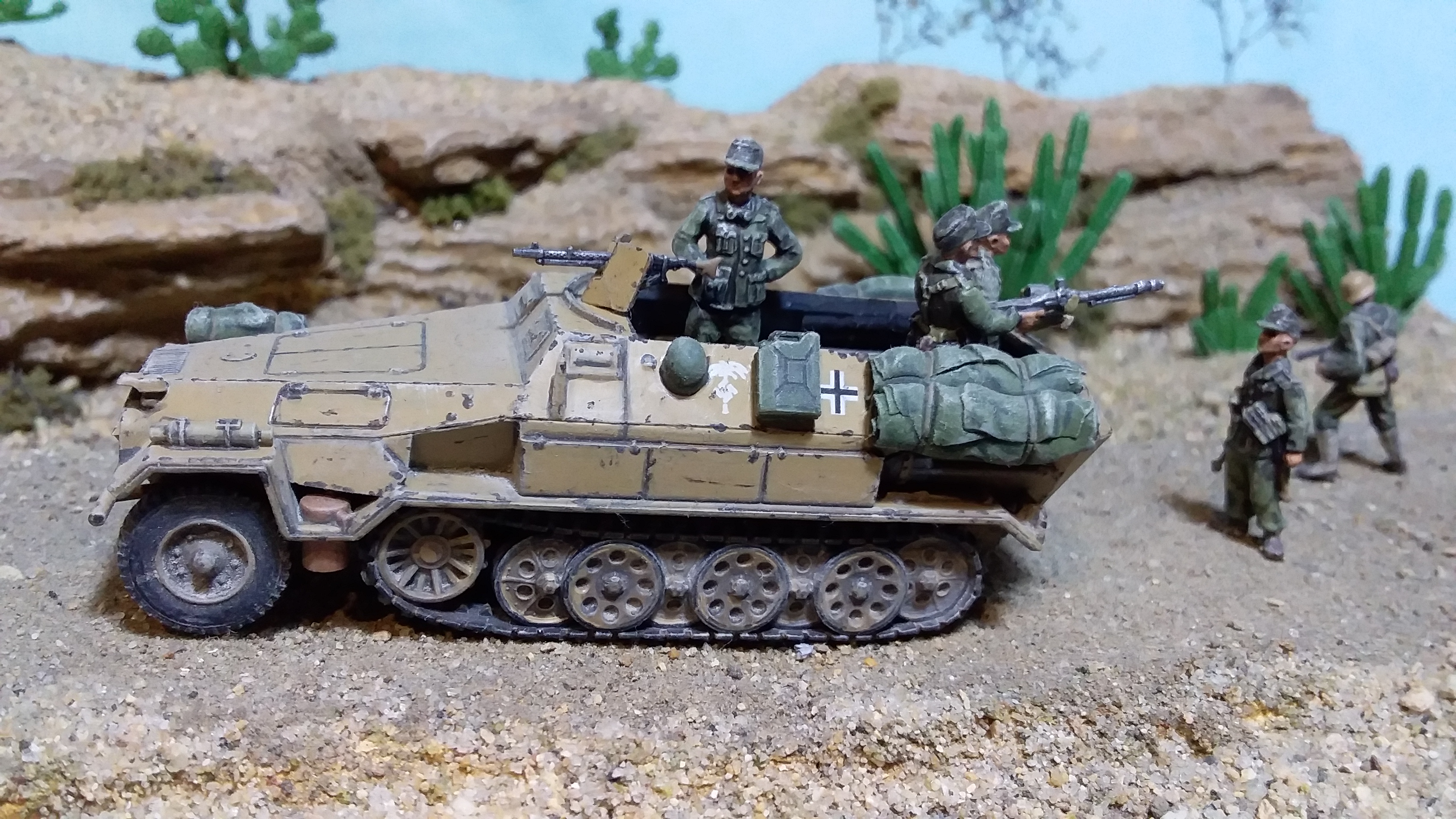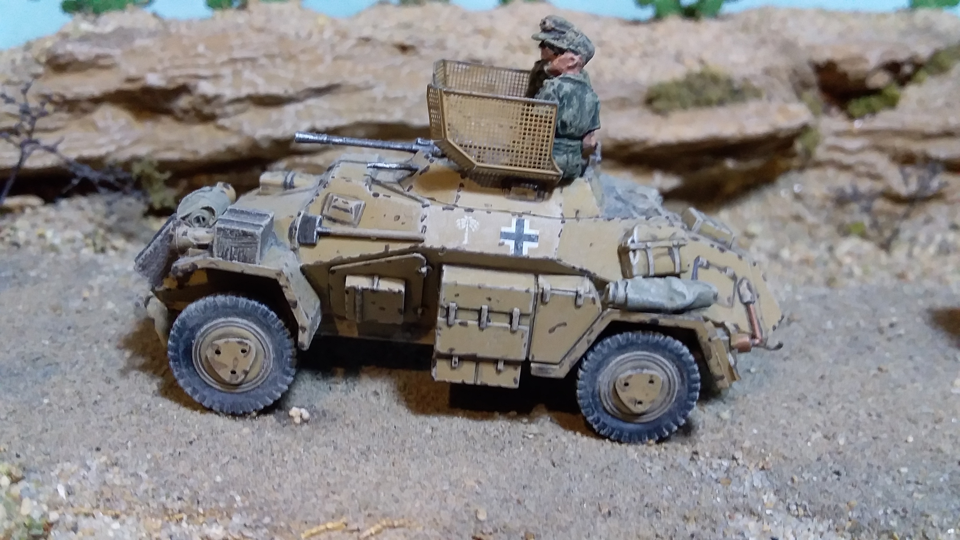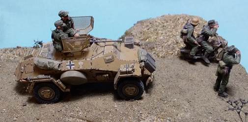 The vehicles are: SdKfz 222 by Dragon I converted the FTF 251 from Ausf A to B by adding a spare Revell MG shield and carving off the tools and vision port visors and hiding the scars under stowage. I used Woodland Scenics rock molds to make the rocky