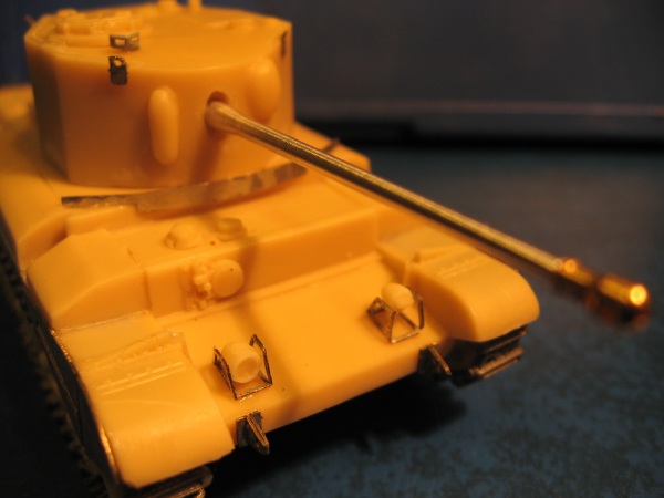 | Christopher used the Italeri Churchill tracks instead of the kit tracks, but did use the kit's photo-etched centerline track teeth. |
