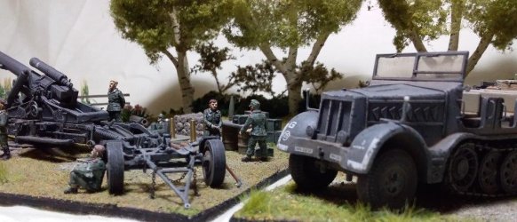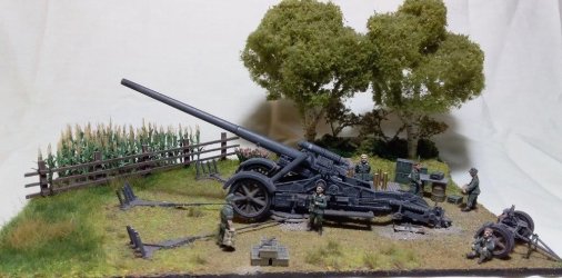 | Here's a diorama I call "The Scarecrow". I used the Revell Kanone 18 170mm Gun and sdkfz 9 Famo kit. The famo with the CMK artillery prime mover conversion kit is the same one already in the gallery. It was supposed to go on the base with the gun but there wasn't enough room. All the figures are by AB Miniatures, most of them are from a POW set. I ordered the MR Modellbau upgrade and accessory set as an afterthought to get some ammo for the gun, therefore it was too late to use the resin wheels and turned aluminium gun barrel. Most of the scenic material is by Woodland Scenics, but not sure of the maker of the corn plants. Monty's caravan (Matchbox) kindly donated the little table made of oil drums and corrugated iron, and the fence is balsawood. Other bits and pieces came from the good ol' spares box. |
