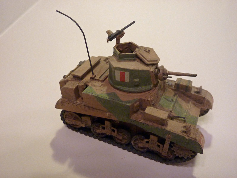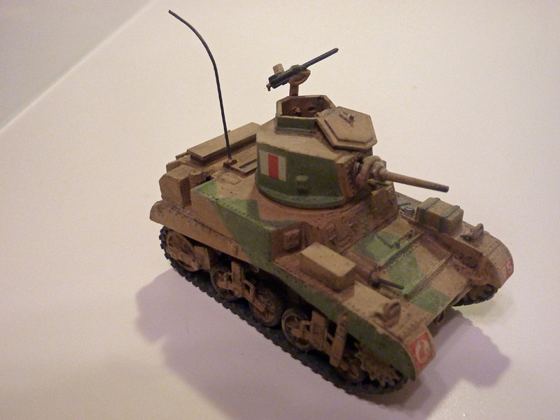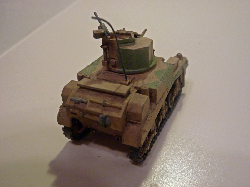 | This is a British M3 Stuart Honey. I made a number of modifications to this Hasegawa kit to get it to a better standard, including: scratchbuilt headlamp guards and kitbashed headlamp, removal of molded on pioneer tools, addition of ammo box to machine gun, covers for old gun ports, and much more. |