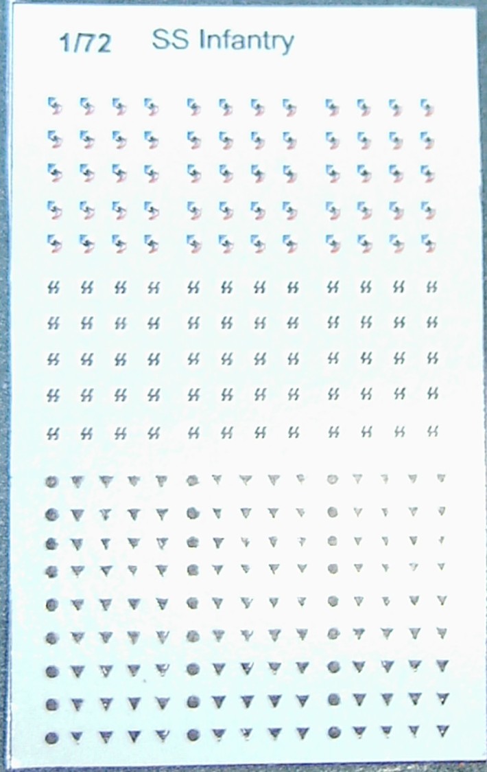 | German SS Infantry uniform insignia | - The only available decals of this type as far as I know. You get 60 SS helmet decals; 60 tricolor helmet shields but with blue instead of black and 27x5 sleeve insignia for the ranks of SS-Oberschütze to SS-Rottenführer. On the black triangles the white stripes suffer from irregular printing to the extent that some are plain black. Adhesion is not very good, but decals are thin.They are printed on continuous film. - R Haelterman | Picture | ||