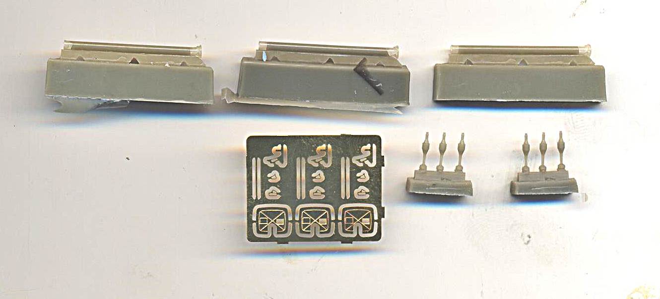 71006Panzerschreck Very delicate and well detailed resin and PE parts for 3 Panzerschrecks (with protective shield) and 6 rockets. The ends of the tubes are hollowed out. No instructions or pictures of the assembled weapons are given, so the modeler will need to do some research. Length and shape of the tube seems spot on, while the length of the rockets seems to be more difficult to assess. Most pictures and dimensions I find show a rocket with a substantially longer shaft, while a few show a model that has a shorter shaft, which the resin parts capture well. I am not sure if the shorter model was regularly used on the Panzerschreck, though.- R. Haelterman