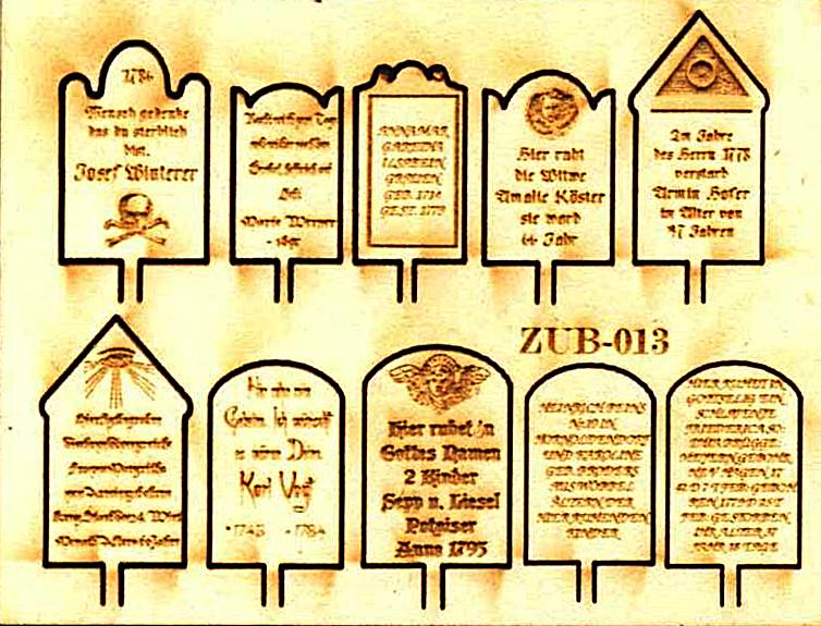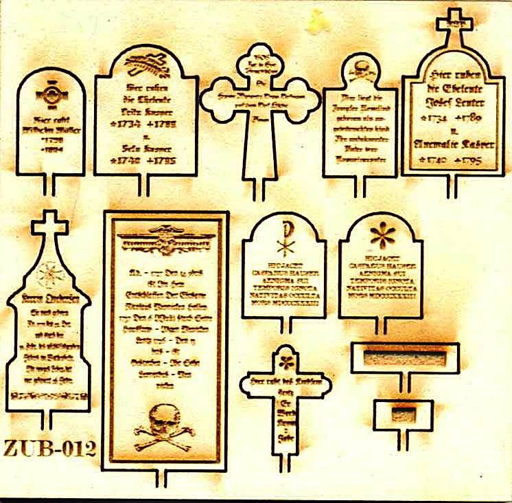 | GL-ZUB-013 | Gravestones - set II | Laser cut cardboard with finely rendered inscriptions. | Picture | ||