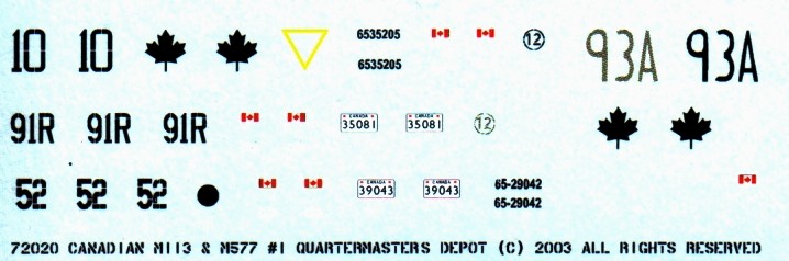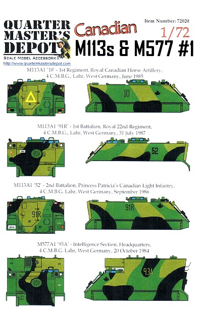 Markings for three Canadian Armed Forces M113A1s and one M577A1. Painting instructions and decals are given for: