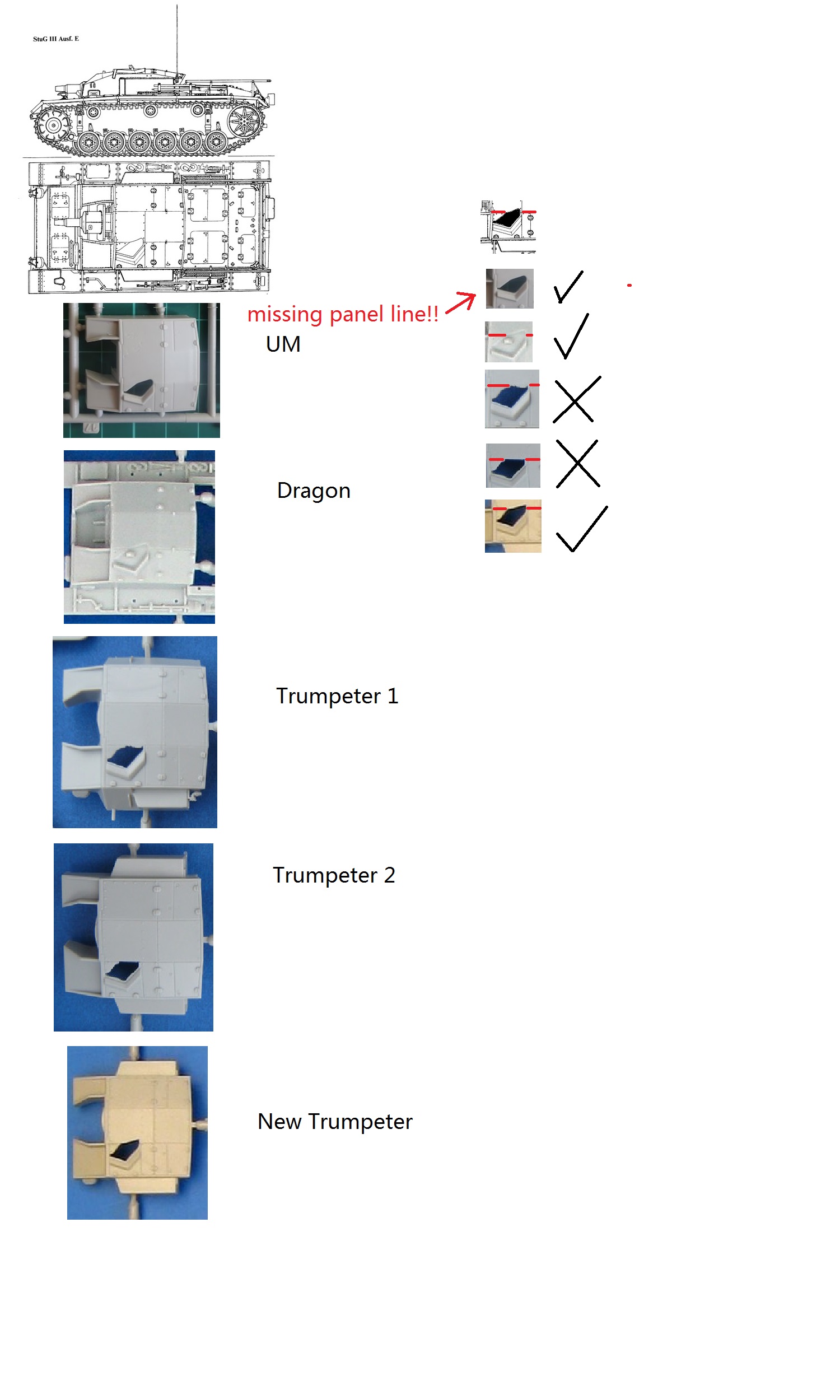 | 07258 | Stug III E | The opening for the periscope on the roof of the hull doesn't look accurate. It seems to be corrected in the Ausf.C/D kit. - Timothy Lau | |||