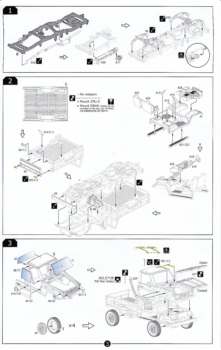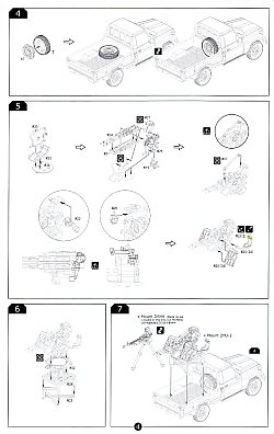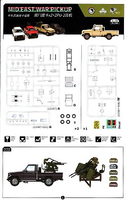 Included inside the top opening box are a pair of kits, with parts for one vehicle armed with a twin barrelled ZPU-2 cannon and another unarmed. Each truck is built from 33 parts of injected light grey polystyrene plastic on a single sprue plus another 10 exceptionally clear parts for all the windows, tail lights, marker lights and head lights. There is also a slide moulded cabin and pickup bed. Overall detail is quite nice.