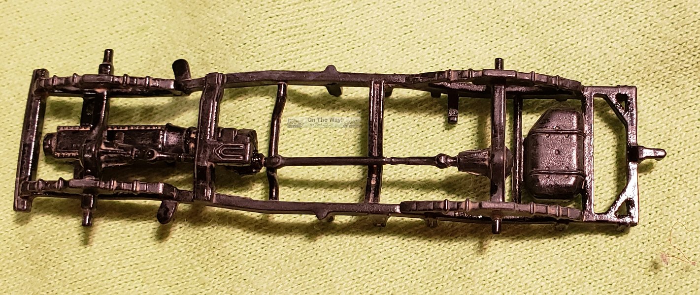 Constructions started at Step 1 with the chassis. This I found too be a bit rough, requiring sanding to smooth it out as much as possible. Instructions were a bit vague regarding the placement of the trans-axles to the transmission. I did not add the exhaust system as directed. A test fit showed that I could add this later (though this would require some tricky manoeuvring around the frame members). I also added a couple of pieces of plastic to represent an engine block.