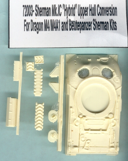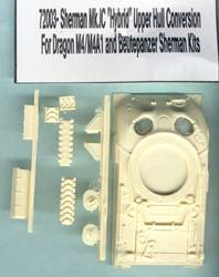 | This Sherman conversion set is designed to convert our regular 1/72-scale M4 or M4A1 kits into a Sherman 1c Firefly Hybrid kit, i.e. a 17 Pounder armed M4 Composite hull in US Army vernacular. The term “Hybrid” is a British term. This is one of my favorite Sherman variants! By looking at the hull we can see that it consists of the front 1/3 of the cast large-hatch M4A1 hull and the rear 2/3 of the welded M4 hull. This combination allowed less welding and faster assembly of the tank. The composite hull was first produced with the small hatch cast hull but the large majority were with the large driver’s hatches. Even though it is a large-hatch M4 it has the original dry ammunition storage in the hull sponsons, hence the three appliqué armor plates on the hull sides. This conversion kit is designed for the Dragon kits with VVSS bogies but I recommend we use the Trumpeter M4A3 kit with VVSS suspension as the Trumpeter model is a decent kit and the Dragon hulls are just too nice to not use. I have not seen this composite hull used with the wide HVSS bogies but there could have been post war upgrades. The upper left, smaller storage box mounts on the rear engine deck of the Firefly 1c so would be normal for this Firefly 1c Hybrid. Check you references as there could be field modifications and exceptions. In the center we have two small spare-track brackets that mount on the glacis plates below the driver’s hatches. Below center there are two long strips of spare track. These lengths of track could be mounted on the front, or after being bent in hot water attached around the Firefly turret. Again, check reference photos, as there could be great variation in applying spare track as supplemental armor. On the other pour plug are the two hatches and front fenders. The hull piece has the features of the Firefly: the long (gun cleaning?) rod on the left side of the engine deck and the 17 Pounder gun travel lock lying down on the engine deck. Particular to British Shermans and Fireflies are the two bottle-shaped fire extinguishers mounted on the rear corners of the engine deck. On the left of the rear plate is a small (first aid?) box. On the sides of the resin hull we see the three applique armor plates, characteristic of dry ammunition storage in the hull sponsons. The only problem, though not major, is that the weld seams between the cast and the welded hull sections appear too prominent for the scale. On most composite hull Shermans the hull weld seam should run through the right front appliqué armor plate indicating the appliqué armor was of two pieces; 72nd Brigade depicts this appliqué plate covering the hull weld. A third variation I’ve seen is the appliqué plate with a split with no weld connecting the two plate parts.