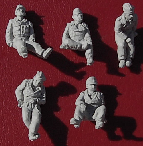 1. Packaging: Plastic bag with zipper 2. Type One piece metal figures, 1/76. 3. Quality: This set has some nice poses and is well sculpted, although the anatomy of the faces is open to conjecture (I like them, some find them dwarfish) Five full figures are included, all reclining or sitting somewhere on a tank. 4 are wearing the black uniform, while the fifth is wearing a two piece denim. The setting possibilities are endless, but I found that they would sit perfectly on a StuG. Apart from that, I'll let the figures speak for themselves. Nice and a bit off the beaten track. Useful for any 1/72 or 1/76 scale diorama depicting a relaxed summer scene. My set had a bit more flash than usual for AB.