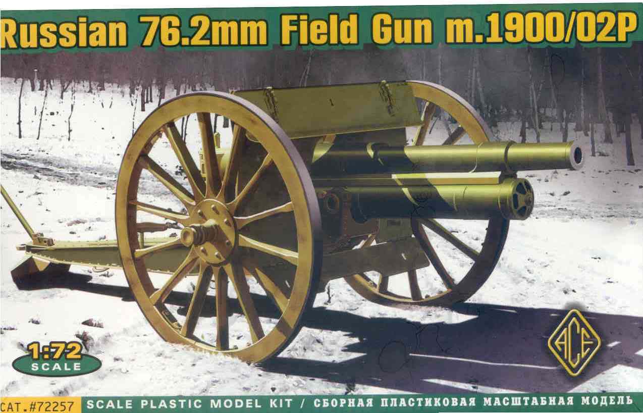 This light field gun can be modeled in service with the Russian Army of World War 1, with the Red Army during the revolution, with the Finnish Army during the Winter War and the Continuation War, with the Polish Army in 1939 (recalibered to 75-mm) (*), and with the Romanian Army during WW2 as the 75-m model 1902/36. The weapon was a design common to it’s time with a recoil system under the barrel and a single trail, comparable to the French 75-mm M1897 and Krupp FK96. The gun and its limber came with wood spoke wheels and was horse drawn. The above high quality box art shows