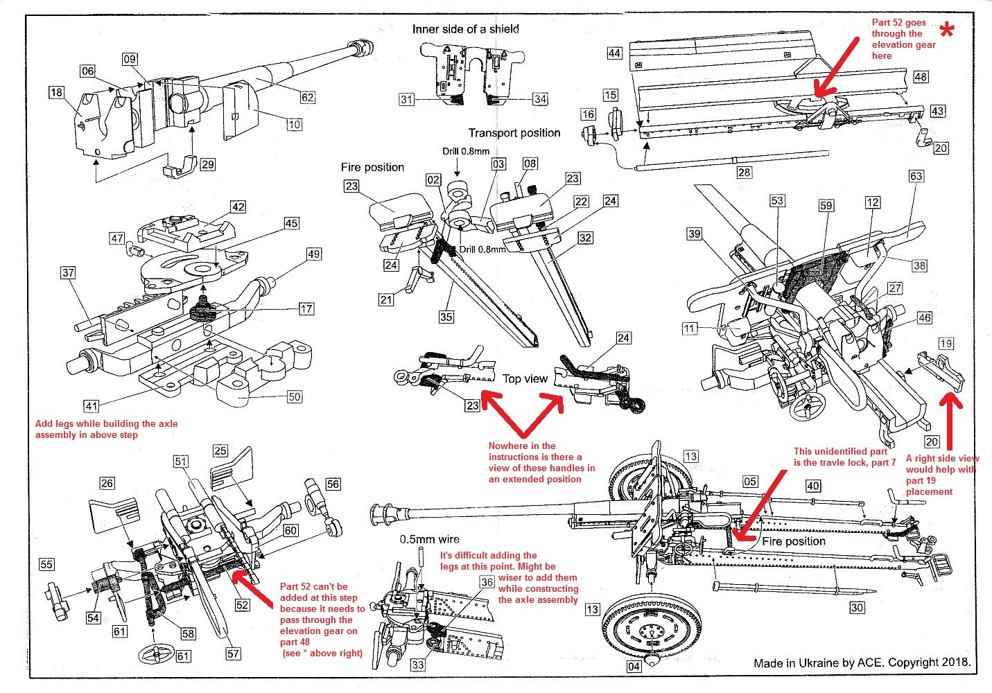- Due to mold shift I used bent wire for trail handles. Instructions do not provide a part number (part 8) nor do they show how to fit