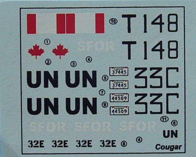 Based on the same Pirahna chassis as the LAV only this time with six wheels instead of 8, The 6 wheeled version was in service before the LAV in the Canadian Army. It was employed in 3 versions the APC, the FSV and the repair version. This is the Fire Support Version mounting the complete turret of the British Scorpion tank mounting the 76mm gun. The Hull has the same breakdown as the LAV series only shorter for obvious reasons ! the hull is nicely detailed with the drivers hatch open in four pieces with the troop compartment roof being specific to each version, The other sprue contains all the hull fittings including the exhaust. The turret is the same as the Scorpion tank which gives rise to hopes that we will see one in 1/72nd in the future. The roof hatches are open, It is very nicely detailed and correct in shape. The suspension is the same as used on the 8 wheeled LAV, although only 6 are needed. The wheels can be made to rotate, also the front two wheels can also be made to turn or at least posed with the wheels turned without any problems or messing. The kit contains the same rubber tyres as the LAV, these are very nicely detailed Markings are provided for 5 vehicles all Canadian, 2 white UN vehicles, 1 SFOR and Canadian based one in green the other green and black. This is a very nice kit of an unusual vehiclewhich was typically released after I tried to convert the 8 wheeled LAV! The kit scales out well to 1/72nd according to the references and drawings I have. References Janes Armour and Artillery 1990-1991 11th edition by Christopher Foss. Jane's Tanks and Combat Vehicles Recognition guide Second Edition by Christopher F Foss