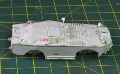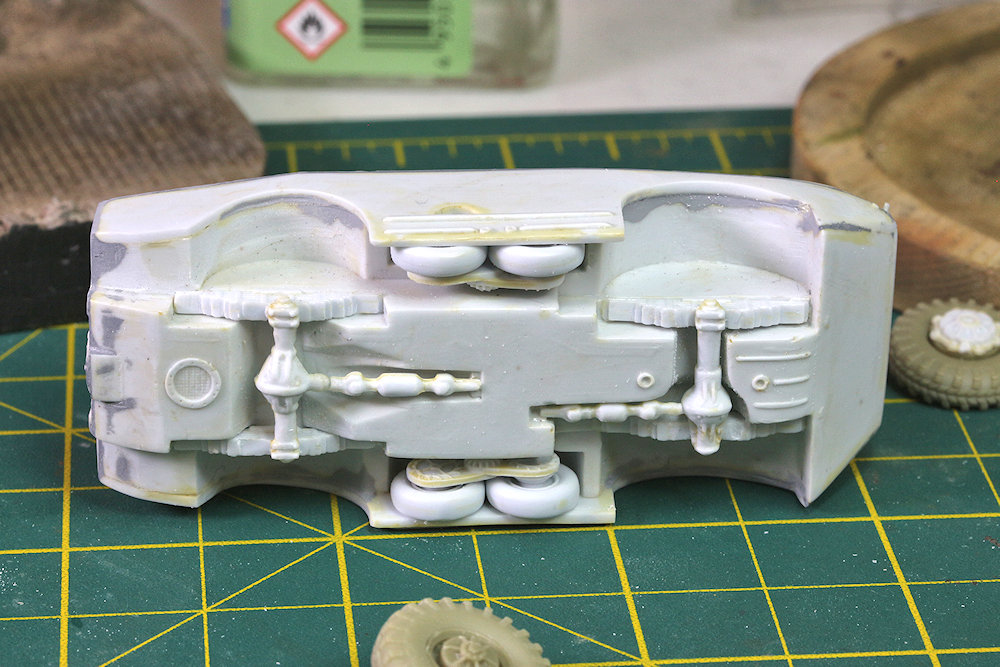 later. I have seen several reviews of the model over the years, and with few exceptions, the builders all complained about what a terrible kit it is. I won't sugar-coat anything; yes, this is a limited-run kit with all of the trials that go along with such, but considering the kit's accuracy and its high level of detail, not to mention that it's the only kit of the BRDM-1 to have ever been released in plastic, I think such complaints are unfair. If you buy a limited-run kit, then be prepared to build a limited-run kit. I have no complaints about the time spent cleaning up roughly molded parts and scratch-building replacements for some of the more delicate details. This was one of ACE's earliest releases; I think that at one point the kit may have been re-released with rubber tires to replace the original plastic ones, but I can't recall for certain. Regardless, it is long out of production and no longer in the ACE catalogue. For me, the weakest part of the kit were the tires. Not only do the wheels have too small of a diameter, but the tread pattern is nonexistant on the surface due to molding limitations. However, I had bought a set of replacement wheels from Tankograd that are labeled for both the BRDM-1 and BRDM-2. But my research has shown that the BRDM-2 tires had a slightly larger diameter than the BRDM-1, and the size of the resin wheels was more appropriate for the larger vehicle. Thus, the wheels are slightly too large for this model, though it's not really apparent. I did have to enlarge the front wheel well openings a small amount, but I would have done that anyway, as the shape was just a little bit off. I have no idea why, but I did not take photos of the Tankograd resin wheels during construction, but you can see them in the following photo: The Tankograd wheels are really quite beautiful. The wheel hubs come separate from the tires, and I had to do a little bit of carving to enlarge the opening in the tires so that the hubs could fit. But otherwise, they have a gorgeous tread pattern, and the wheel hubs are very finely detailed. However, they were not designed for this specific kit, so that in order to make them fit properly onto the axles in the wheel wells, I glued the plastic kit parts #4 to the insides of the wheel hubs, as can be seen on the wheels in the background in the above photo. I do not know if these wheels are still available for purchase. I cannot find a website for Tankograd, and Tracks & Troops no longer has this item listed in their catalogue. In the following photo you can see the extensive puttying I had to do to make all of the hull edges and corner square. I used several different putties over the years, hence the different colors. The photo also shows an area of the hull side to the rear of the front wheel well that had excess material on it, forming an angle that needed to be removed so that it was a straight line perpendicular to the ground. Removing this wedge of plastic also helped the slightly overlarge Tankograd wheels fit better into the wheel well. The hinged, mechanical arms that swing the front water splash plate upwards were much too long to attach properly, but were easy enough to shorten. The following photo shows a small correction to make to the right side (only) of the fighting compartment. When I was trying to attach the long crowbar to the hull deck, it wouldn't fit alongside the fighting compartment. I looked at walk-around photos online and saw that there was a small notch cut out of the corner of the fighting compartment that allowed space for the crowbar (and a tow cable, not added here) to fit alongside the hull. It was quick work with a file and sandpaper to craft this notch so that everything then fit properly. You can see in these pre-construction photos that I scratch-built a number of the smaller details, such as the headlight brush guards, the winch guides on the nose and rear of the hull, the machinegun mount, the crowbar, and a couple other items. Unfortunately, it's hard to make out what I scratched because the styrene plastic I used was the same color as the kit parts. The forward and rear towhooks in the kit have the wrong shape for this vehicle. Since I didn't have any replacements, I used a file and sandpaper in an attempt to reshape the kit parts, but was not entirely successful. Also, in retrospect, I attached them upside down. Here is a simple tip: when having to clean up very small parts, too small to adequately hold in one's fingers while grinding and sanding, I find it easier to clip a section of the sprue, leaving the part still attached, so that I can hang on to a larger piece of plastic while doing most of the clean-up work. When finished, I snip it off the sprue, clean that last little bit of sprue attachment point, and voilą! For some parts like headlights, I finish sanding off the sprue attachement after the part is already attached to the hull, if the attachment is strong enough (as with super glue). I have no idea what the underside of this vehicle should look like; I imagine it's something like this. Suffice it to say, there was a bit of grinding and sanding to locate the axles in the proper place within the wheel wells. Unfotunately, my eyeball was not good enough to get the front and rear axles level with each other. The completed model looks as though the rear end is jacked up a small amount. It's not too terrible, but it was a rookie mistake nonetheless. In the Preview for this kit, I had stated that the four auxiliary wheels in the center of the hull could be posed retracted (as pictured) or extended. I'm not sure why I said that because to pose them extended would take a bit of carving and resculpting to accomplish. But it could be done if one wanted it badly enough. I will admit here to not putting a lot of effort into cleaning up the underside parts, as I plan to secure this vehicle to a display base at some point, so the undercarriage won't be visible. And here is where we get to my disappo