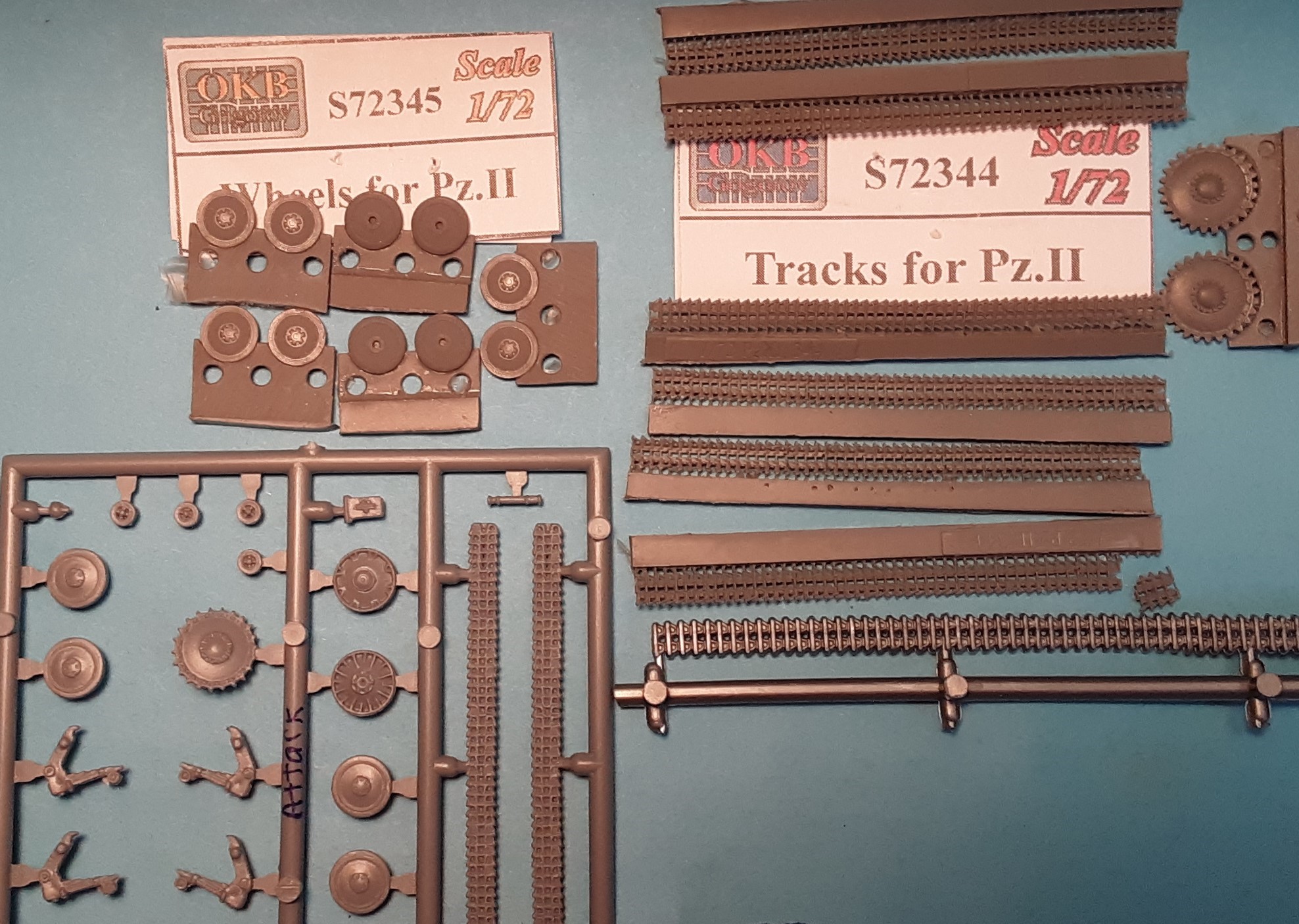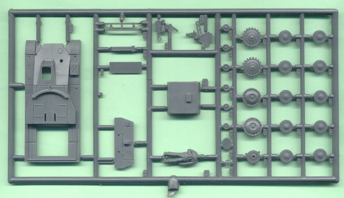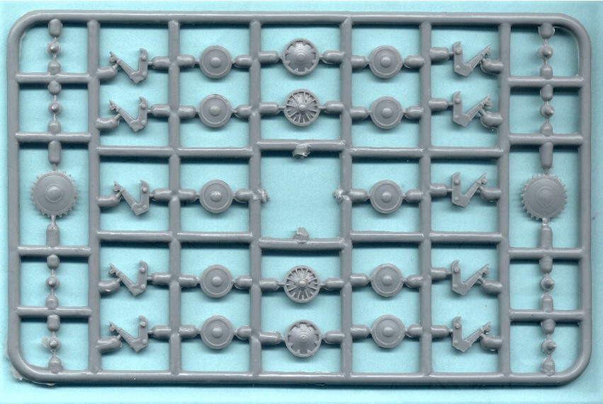 Parts Photos of the sprue above and below show the sharp molding of the ESCI/Italeri model kit despite its 20+ year old molds. Note that the driver’s hatch may be modeled open. The leaf spring suspension is molded onto the lower hull sides (parts-3 and 4). Top center are the howitzer carriage parts-75 & 76. Bottom center is one of the two crew figures; the 2nd crew figure is missing from the sprue, so see the sprue photos at Henk of Holland website (https://henk.fox3000.com/italeri/7061/09.jpg) to see the complete sprue. Be aware that the gun rounds (parts 5 thru 18) in the center of the sprue below don’t look to be correct for a 10.5-cm leFH18, as these look more like the 7.5-cm fixed rounds used in the StuK 40 and KwK 40 guns used in the StuG III and Pz IV respectively. The muzzle brake for the ESCI kit howitzer (part 33) may be drilled out to improve detail (no slide molding for this 30-year old kit?). The ACE Models Wespe model is similar to the ESCI/Italeri parts and how they go together; a main difference is the increased number of parts for the leFH18 howitzer and the suspension being separate parts and not molded onto the hull side. In the sprue photo below, we see the correct size 10.5-cm howitzer shells and cases (parts 70 & 71) at far left. The howitzer muzzle brake is in two parts so we should not have to drill out the muzzle. The ACE Models 10.5-cm leFH18 includes a gunsight (part-52) and more realistic shells and shell cases (parts 70 and 71) that are missing from the ESCI/Italeri model kit. The ACE Wespe model includes a greater number of interior parts and superior detail shown in the sprue above. The sprue of the ACE kit wheels below is the same as in ACE Panzer II model kits. ACE gives us two choices of idler wheels (parts 18 or 19), and separate right-side and left-side leaf spring bogies (parts 15 & 16). The separate bogies allow to more easily change them to model the roadwheels over irregular ground. The flexible black plastic band track from the ACE kit eclipses the stiff silver color polyethylene plastic track in my ESCI kit. The ACE track can be joined with super glue and I have read that the track should be painted with primer to curb a bad reaction with the styrene plastic wheels. I recommend the ESCI track be softened in hot water to bend it around the wheels, then use special super glue with a tube of activator to fasten the polyethylene plastic track ends together and to affix the track to the wheels. To significantly improve either the ESCI or the ACE Wespe of Pz II smallscale model I recommend the aftermarket cast resin tracks and wheels from OKB Grigorov, shown at the top of this photo, or from other aftermarket suppliers. Lower right is the ESCI/Italeri track. (At lower left is the Attack Models Pz II kit styrene band track, wheels and leaf spring bogies for comparison.)