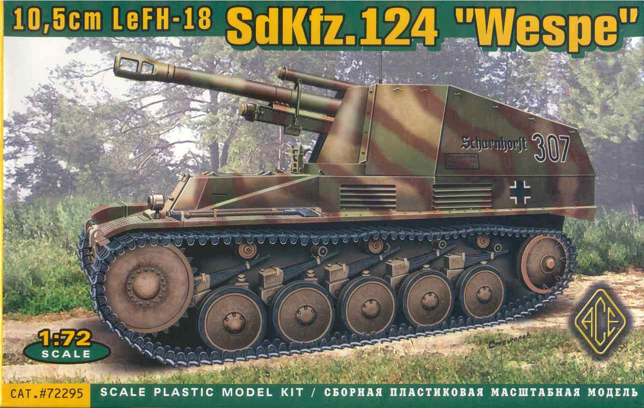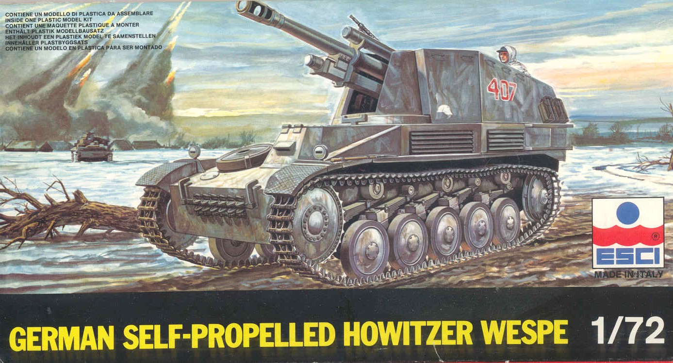 by Italeri. The boxart for the Italeri 1/72-scale Wespe model kit 7061 shows a photo of the actual competently built and handsomely painted model. From the top we see the open superstructure resembling that used by the Marder Panzerjäger series. On the glacis is a spare roadwheel which is a standard location for the spare wheel on the Pz II. At the rear of the port side visible here is a storage rack that is not typical for the Wespe. From the drape of the track over the wheels and lack of track guide teeth, this appears to be the dreadful stiff polyethylene plastic track common to many old ESCI model kits; note the lack of track sag. One of two crew figures is visible in the driver’s hatch. Italeri finished the model with a nice 3-color soft edge camouflage. The only markings are some unit emblems at the portside rear. The builder appears to have drilled out the muzzle. Boxart for ESCI kit 8004 shows an accurate representation of a Wespe in what looks like a cold day, and with a Nebelwerfer barrage launching at the far-left background. At the rear portside corner we see the storage rack made from narrower metal strapping than the model kit represents. The vehicle is finished in what appears to be dark gray with a winter whitewash. Markings are a red vehicle number and a white helmet marking indicating this Wespe is with the Panzergrenadier Division "Großdeutschland” on the Eastern Front. The boxart for the 1/72-scale ACE Wespe kit 72295 shows the same port side as the above two boxart. The artwork looks accurate and the paint scheme and markings very well done. This is a good view of the wheels and leaf-spring suspension. I am curious if the leaf-springs were actually painted black. Note the engine vents here on the port side under the gun mount. The rear of the Italeri box shows a color painting guide with 3-view drawings of three different Wespe vehicles. The paint scheme and markings of these three Wespe do not match the vehicle on the front of the Italeri or the ESCI boxes. Since the Wespe was in production from early 1943 we can find it in dark gray, or in panzer yellow and camouflage colors. Kit