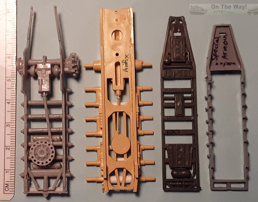 (tan plastic), note that the roadwheels use a leaf spring suspension which was a feature of the Sd.Kfz. 7 during its production. The ACE Sd.Kfz. 6 frame, left most, is more