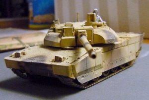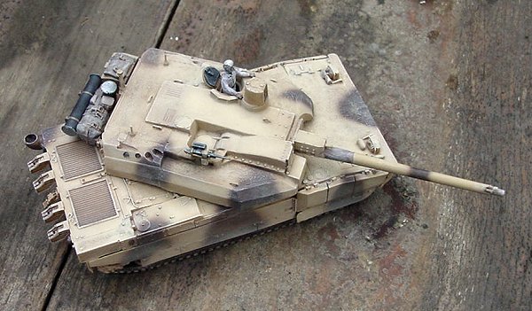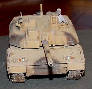 What I have painted, in fact, represents a French Leclerc on maneuvers in Qatar. It turns out that the UAE tanks have a very large number of very obvious differences from the French tanks. Even more than I imagined. While building my tank, I had seen photographs of tanks with two different "desert" paint schemes. I had incorrectly assumed that the solid yellow scheme was early UAE tanks, and the camouflaged version (which I painted) was a late UAE tank. In reality, the UAE tanks are the solid yellow ones, and like I said, have many obvious external differences from the French tanks. The paint scheme I used is for the French tanks in Qatar.