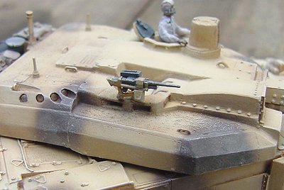 The photos I have seen of a UAE Leclerc showed the commander wearing a white, short-sleeve shirt and hat, which is why I painted my figure in white. But the Jane's cover photo, which is of the French desert version, shows a commander wearing camouflage shirt, and a black helmet. Drat! Maybe next time.