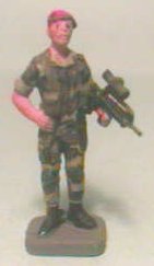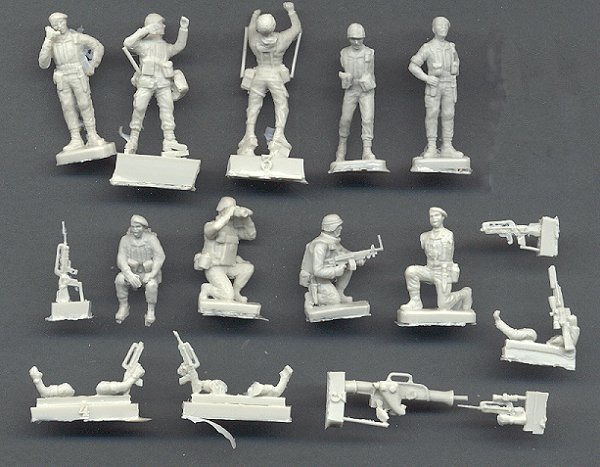 How many of you have ever wanted to duplicate in resin the finely-molded figures from ESCI, which are unfortunately molded in a notoriously unworkable soft plastic? Well, ADV Mini has done that, and gone one better. Using figures from several of the ESCI sets (US Infantry, NATO Infantry, etc.), they have modified them appropriately to represent soldiers in the modern French Army. This is the second set of figures from ADV, and it compliments the first set by providing some more unsual poses and weapons. Note how finely cast the weapons are; some of the barrel tips have broken, but can easily be replaced. These are highly detailed figures, and I am very glad to see them in the marketplace. I hope more companies will follow suit.