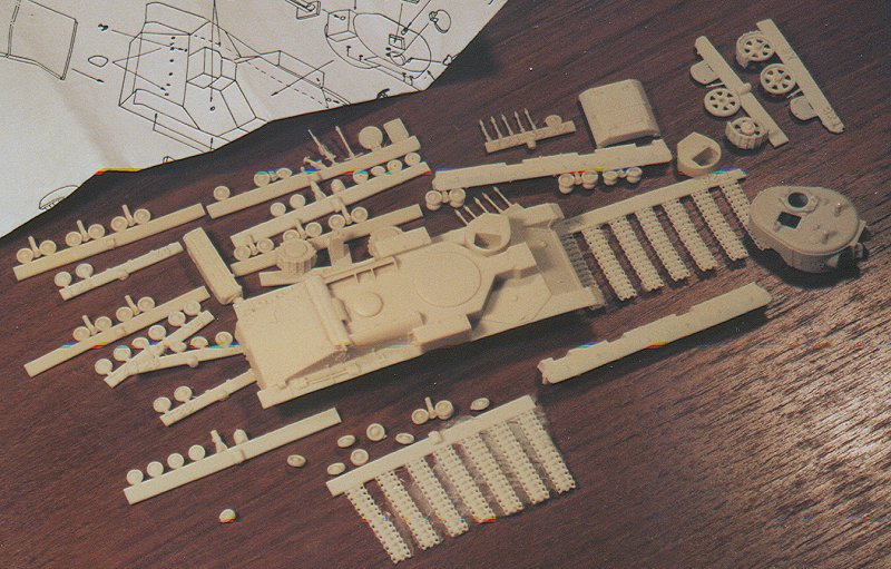 The Al-by Soviet T-28 medium tank, Command version (i.e. with radio) is definitely one of my favourite kits. It has, as you can see, a large number of finely moulded resin parts - note that the individual bogeys are moulded separately (each bogey assembly is three parts). The turret is hollow so it can be built with hatches opened up (no interior detail though). The tracks are resin length-and-link, but the drive and returner wheels come with the track already on. There is a minimum amount of flash, easily removed, and a couple of air bubbles that have to be filled on the back of the hull. The antenna posts are in resin but the antenna itself (not shown) is provided in brass wire. The instructions, shown at the top of the scan, are good, with an exploded view on one side and a detailed line drawing of the tank on the back. This is a "must have" kit for fans of early Soviet armour.