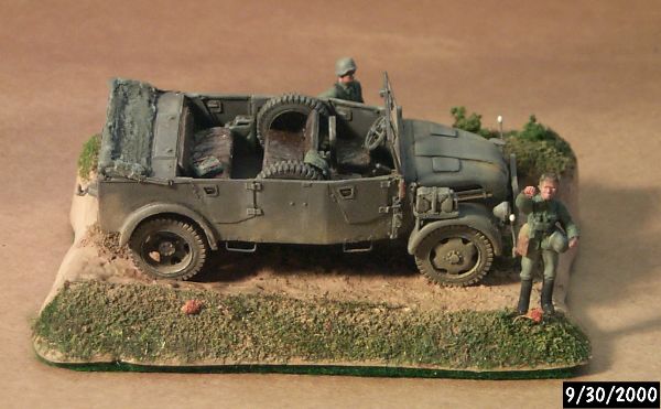 The kit went together well. The major problem was a poor fit on the body with the front hood (bonnet) area, possibly due to shrinkage of the resin. Detail is superb and the parts delicate and strong. I recall only one small air bubble (maybe). I had little problem with breakage. The only things added was a clear winshield made from the box it comes in, wipers, and stowage inside. It was painted with Polly S panzer gray and highlighted with artist oils. The figures are ESCI. The base is scratch built from resin.