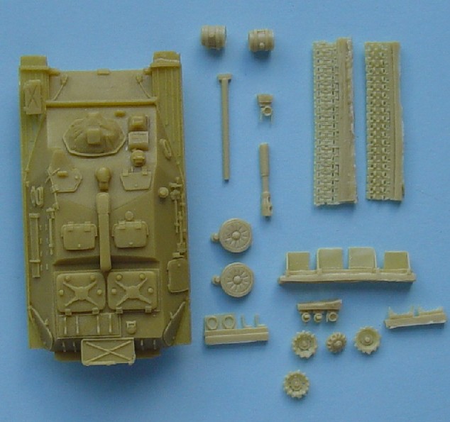 Currently the only ASU-85 on the market (that I know of) cast in the usual buff coloured resin of all Armo kit and to the usual standard, with my example being free from blemishes or faults. The hull is cast in one piece with unfortunately all the hatches closed, that is really only the real fault with this kit, the other being the barrel, which is moulded in two parts, the fume extractor and muzzle brake in one piece and the main part of the barrel the other, here lies the other fault, with the lower portion of the barrel being in my mind a little on the thin side and could be improved by beefing it up a bit or replacing that part with styrene rod of a greater diameter. As with most Armo kits care must be taken when attaching the wheels, to ensure that the correct ride height is achieved, unfortunately Armo doesn't give any indication of what this should be ! according to what I know this should be 5.55mm. The kit uses the same tracks and wheels as the ZSU-23-4 which are also the same as the PT-76 kit. The kit measures out well to 1/72nd scale according to my references. references: Janes Armour and Artillery 1990-91 by Christopher F Foss