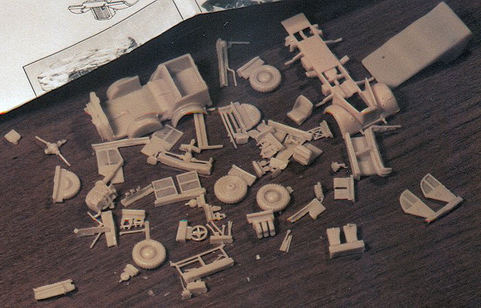 This is my first Armo kit and I am really impressed. Not only is this the first 1/72nd Kfz 15 I've seen, it is also an incredibly detailed model. Note the pennant holder, the engine and the other detail parts included in the scan below. There are a large number of parts included, all in a slightly brittle,beige resin. There are, apparently, three different versions of this kit available. The model I purchased from Philip at Troops-and-Tracks was the version which is shown with the spare wheels covered, the canvas top in place and side windows. I'm not certain if they all come with the side windows but the other versions seem to have the spare wheels exposed. There is very little flash, only over the window openings. I noticed a couple of very small air bubbles which will have to be filled. The kit come with the aforementioned engine (four parts I believe) and can be built with the hood open. Three jerry cans are included with separate handles. Instructions consist of an exploded view drawing and pictures of the three finished models. Way to go ARMO - this kit is a real masterpiece!