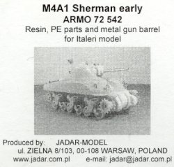 ARMO has released two versions each of the M4, M4A1 and M4A2 (as well as a couple unique versions such as some early Fireflies). For each of the pairs of kits, they are labeled one each as "early" and "late", which is deceptive in a way, since these are all "early" Shermans. The "early" and "late" designations refer to two distinctions between each kit: the nose piece (final drive housing) and the gun shield. The "early" versions of each of the M4, M4A1 and M4A2 have the early, three-piece bolted nose and the M34 gun mantlet (without the armored wings), and the "late" versions have the mid-series, rounded, cast nose, as well as the later M34A1 gun mantlet (with the armored wings, as seen in the Italeri kit). But again, in all cases, the hull is the early, 56°, small hatch version.