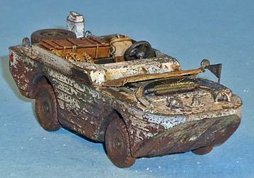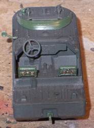 Painting and markings The vehicle was sprayed in a uniform green enamel color. Two coats of AK chipping fluid and a coat of acrylic white followed. Moistening the paintcoat ten minutes later and some persuasion with a stiff brush gave the result seen in the pictures. The rest is traditional weathering. Note that I chose to paint the seats in a leathery color, solely for artistic purposes. The same argument goes for the whitewash, for that matter, as the only picture of the vehicle doesn't show any. Markings are completely absent in the picture, so none were applied.