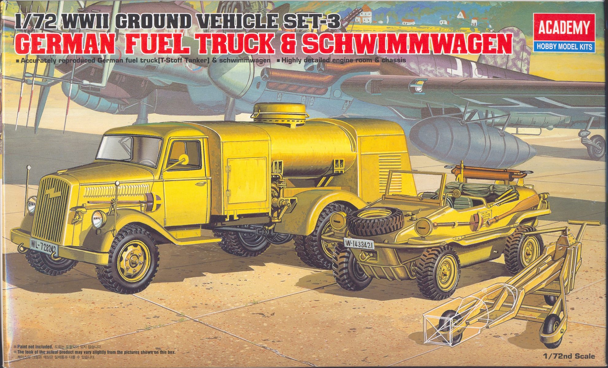 latter were beyond the reach of my modeling skills. It's a pity that Academy only provides a stowed hood, and, to boot, one that doesn't even fit nor exactly look like a real folded cover would. The oar that is fitted just below it also gets in the way, so this really is an area where Academy messed up quite badly. I needed to shorten the oar by a couple of milimeters to make it fit. As I was trying to build the exact same vehicle as in the picture below, I didn't fit a Notek (neither front or rear), but I did fit the shovel. The picture doesn't show it, but it might have been fitted. I cut off the attachments of the Eduard shovel (which is too flat) and added it to the Academy plastic part. The MK72 wheels are a drop fit as they replicate the fittings of the Academy kit very well. Only minor clean up of the thread and priming were needed. Eduards also provides a command pennant, by the way, which I didn't use. For those building a regular German Schwimmwagen, note that the interior fittings seem to be meant to hold an MP40 and Panzerfaust, and that an MG would probably have been fitted. Personal gear, like canteens and gas masks would be fitted in the (by then) crowded interior. Some minor additions/modifications were performed at the very end. I replaced the exhaust stubs with bent styrene tubing, to make them point to the rear. For those who want to go even further, two small pegs might be added to the top of the windscreen (which held the canvas top in place), and a horn placed below the right front fender. (The picture of "my" vehicle didn't show this area.)