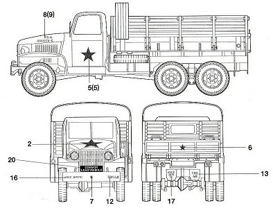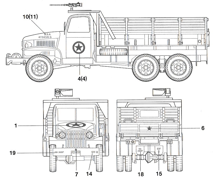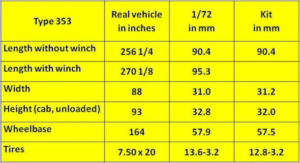 The variant proposed in the kit has a closed cab with a wooden type body, produced until February 1943 (when the asymmetrical brush guard was introduced), proceeding the introduction of the open cab of the late production (4th, 5th and 6th series). The supply catalogue number for the truck 2 ½-ton, 6x6, GMC CCKW was G508. The 1st batch, produced from December 1940 till January 1941, had a civilian cabin and was called CCKWX. The 2nd and the 3rd series were produced January 1941 to March 1943 and their closed cabin could have a rounded hole for the MG. Two types of chassis were used for the CCKW, the type 353 (used in this kit), was the longer one. The shorter version, used for about the 10% of the CCKW production, was called type 352. Another closed cab version, called CCW-353, was a 6x4 variant. The kit gives you the option between the standard bumper and installing the winch, which was used on almost half of the total production (both chassis type, short and long). The kit chassis has a Timken split axle. The Chevrolet banjo type was also used, but this different axle type meant also a different layout of the drive shafts. Compared to the open cab truck kit, the conversion possibilities are even bigger (see Heller/Airfix CCKW review for a short wheelbase 352 conversion) because the closed cab truck kit could also be converted (with some more work) into the 1.5 ton 4x4 variant G506 made by Chevrolet. The 108”x 86” flatbed cargo G506 with the winch was called G7117, G7107 being the number without winch. Good