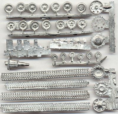 The remainder of the kit parts are provided in cast metal. The roadwheels and hatches are very well done, but the sprocket and idler wheels are a little crude, as is the main gun. The tracks appear to be copies of the ESCI Pz. III tracks, and although they lack detail on the inner surfaces, they will certainly be easy to bend into shape around the wheels.