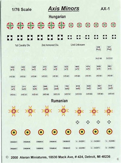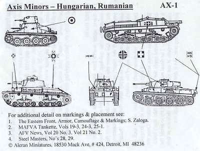 I have not used them yet but look forward to trying them as a refreshing break from German and Soviet markings. The markings appear very sharp, delicate and in register. Usable for R1, R2, Czech 35t tanks, Zryni, Pz III's and Pz IV's used by Rumania and Hungary during WW2. Both early Eastern Front and late Eastern Front markings are included as well as license plates for AFV's and softskins.