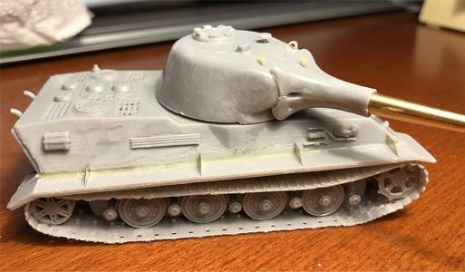Steps 4 and 5 are straighforward (I chose the WW2 variant and not the WoT one); I decided not to mount the jack because it looks ridicolously thin for such a huge beast. Step 6 (turret) requires a good amount of liquid glue to put everything together, closing gaps and creating the rough fusion effect on the turret surface. The metal barrel is a welcome bonus, but it looks much too long in my opinion. One point of attention: you must scratch the 3 lifting rings, although it is not specified in the instructions (but 3 couples of very tiny circles can be seen, acting as guides for positioning of the rings).
