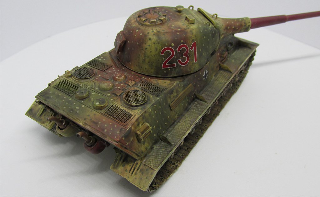 I chose the "dot ambush pattern" which I think is suggestive for a late war German tank. The tiny decal sheet contains some small crosses, so I used some spare decals for the numbering.