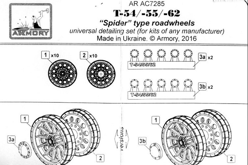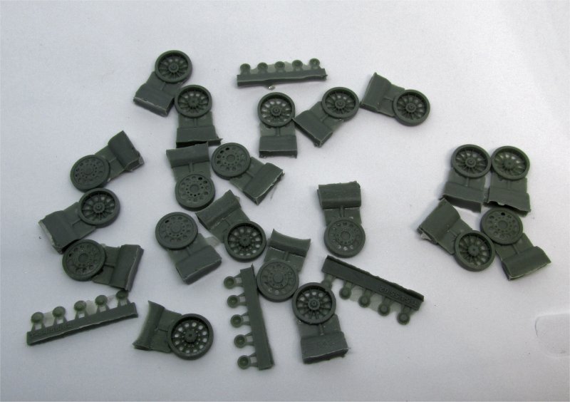 | Early T-54 versions mounted a type of roadwheels generally nicknamed "spider-type", because they resembled a cobweb: they had 12 reinforcing ribs, 12 large lightening holes and 12 small lightening holes closer to wheel hub. The tyre was solid rubber without any perforations on the side. the T-54 road wheels were extremely similar to those mounted on late T-34/85, so that most people think they were the same. On the contrary, T-54 spider wheels are smaller in diameter and larger in width, although I doubt these small differences would be visible in 1/72nd scale. Starting from T-54b, "spider-type" wheels were replaced with the "starfish-type" wheels, which had to become so characteristic of the whole T-55/T-62 family, and older models had their wheels replaced with the newer ones when back for repair. However, it was not very rare to see a T-55 or T-62 with a mix of "spider" and "starfish" wheels, as the older wheels were seldom used as "on-field" replacements. The parts are very well cast, with discrete sprue gates and a good amount of flash, which would force the modeller to clean every single hole (there are 240 !). Hubs are provided separately and they have the correct number of bolts. The instruction leaflet is quite useless because it is not hard to understand how to assemble the wheels.