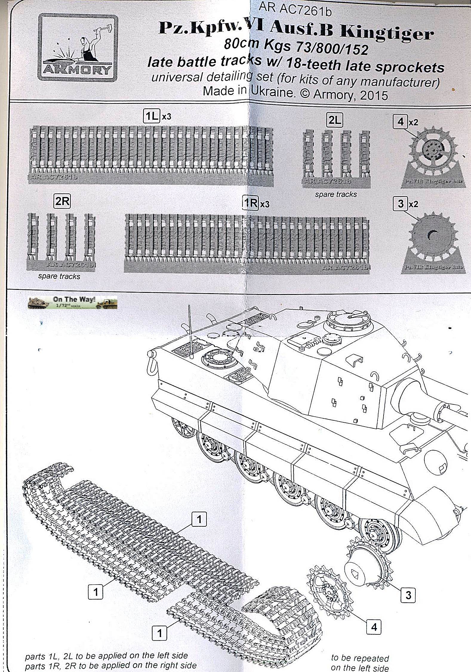 Illustrations of these can be found here. Note that conventional wisdom has it that the Kgs 73/800/152 tracks were handed, which Armory has duly noticed and implemented in this set. (Take care, as the difference is very subtle !) The parts are very well cast, with discrete sprue gates and minor amounts of flash. Even then, due to the finesse of the parts, removing even this little amount will be no sinecure, especially in the open guide teeth. Pitch is spot on for 1/72, but width is closer to 815mm, instead of 800mm, which, admittedly, is close enough in my opinion as it only represents a difference of about 2%. While the instruction leaflet shows the parts that you should get, and where they should go, there is no indication how to get them to take the shape that they are supposed to take. I have heard this is best tackled using a hair dryer but I will need to see how this works out. Conclusion: