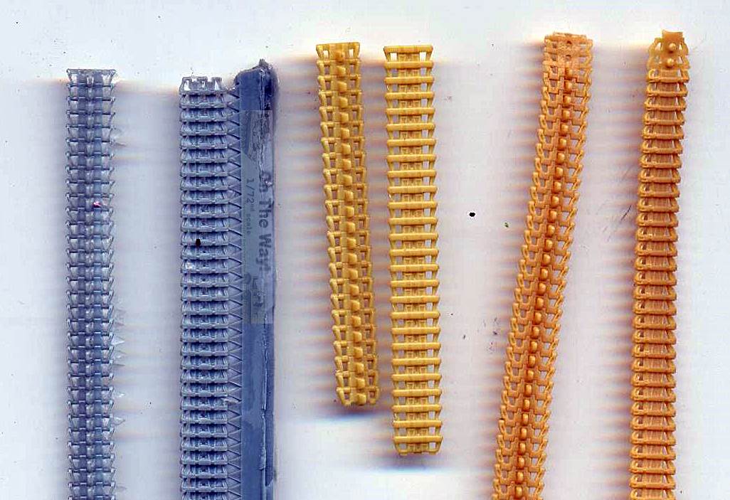 Compared to the tracks in the Revell Nashorn kit (middle) and Dragon Nashorn/Hornisse/Hummel kit (right), the Armory tracks have the upper hand. Not only are they more delicate with sharper detail, they also are the only ones with open guide teeth and a center section that retains the V-shape of the skeleton track. (The others have a parallel section.) All three brands represent the same style of track.