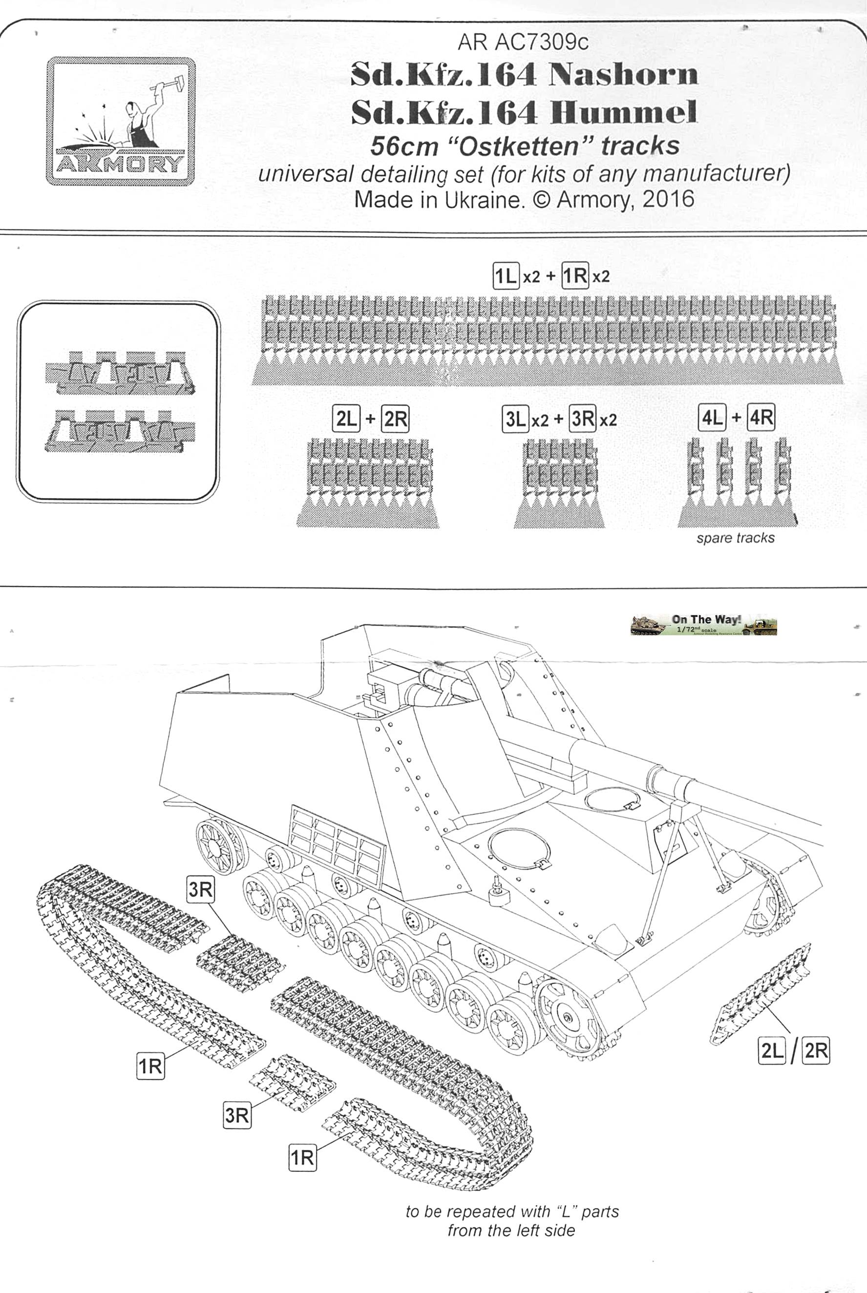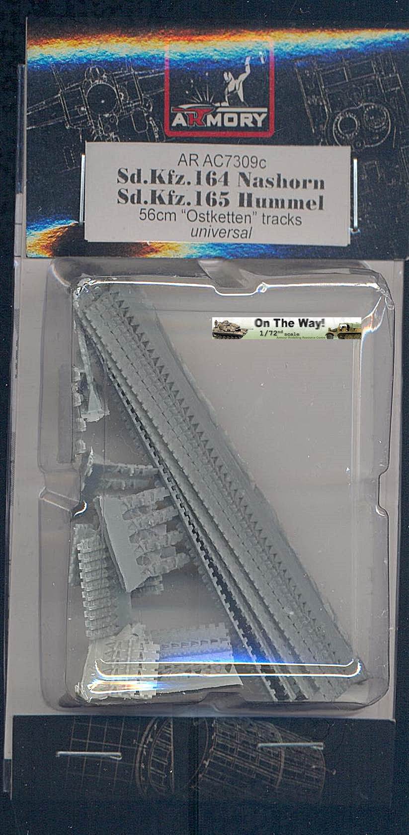 | After the first encounters with the Russian climate (and its effect on the road conditions), Germany developped wider tracks for their Panzer III and Panzer IV (and their derivatives). Two types saw service: Winterketten and Ostketten. The former (which appeared first, in the Winter of 1942/43) was basically a standard track with extensions (similar to "duckbills" for Sherman tracks), while the later was a wider, more uniform track, somewhat reminiscent of a Panther track. This set of Ostketten is based on a late type track (with chevrons). Note that Ostketten are very rare on Nashorns and Hummels, while much more common on StuGs and PzKpfw. Technically, there is no reason the Nashorn/Hummel could not be fitted with Ostketten, as the tracks were exactly the same as on the StuG III & StuG IV and PzKpfw III and PzKpfw IV. Still, the only picture I have found of a Nashorn with Ostketten so far is on page 30 of Nuts & Bots 14 (also shown here). Given that the tracks of the Hummel and Nashorn were a tad longer than those of the Panzer IV and even more so than those of the Panzer III, I guess that buying this set will allow you to procrastinate when making up your mind about the vehicle to use them on. The parts