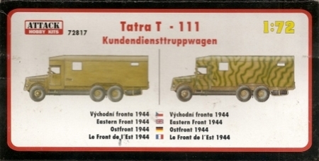 Brief Description of Contents The kit comprises over 70 parts, including a small frett of etched brass and clear plastic for the windows. Many parts are common to the Tatra T-111 open cargo truck (Attack 72836). The difference between this and the open cargo truck is the enclosed van body, & the drivers cabin roof. The chassis and drive train, and rest of the cabin are the same in both kits. The kit is cast in pale grey & black plastic, the wheels also being cast in one piece hard plastic. Decals as per box art, with two choices of WH number plates. Construction As with the open truck body, The entire drive train, axles, suspension, & exhaust is cast as one piece, and the piece supplied with this kit was badly out of shape. It had two large bends, making it resemble a long tilde (~) instead of being flat. The sprue it was attached to was also in the same shape, and I could find no stress discolouration where the two bends were, so it appears it was cast in this shape, or hardened in this shape. Fortunately the plastic is soft, rather than brittle, so I was able to bend it back to a flat shape. The cabin pieces are a fairly good fit, the radiator needs some fine sanding to ensure a flush fit. The driver's cabin doors are moulded shut. The bottom, sides, ends and roof of the van body were a reasonabley good fit, but all needed a fine sanding on the edges to get a flush finish and very light filling was also needed on most joins. The rear door can be assembled open, the side door is cast closed. I didn't like how high the van body sat up over the chassis. Comparing this to the two photos I have of this vehicle, one of which is a side shot, and to the instructions and box art, it was clear that the van body was sitting way too high in this kit, very noticeable over the wheel arches. I considered how to address this problem. There is no easy fix - and I couldn't just ignore the problem, it was visibly very wrong. In the end I sanded down the chassis (which is two long parallel beams that run almost the length of the vehicle) by a millimetre or so, then sanded down the underside of the van body floor, as well as sanding two deeper 'grooves' so the floor of the body would sit a bit lower on the chassis. This solved the problem. As a consequence I also had to sand down the underside of the drivers cabin roof by perhaps a millimetre to lower it to the right level to join the body. I didn't like to do this but it was essential, and less noticeable than leaving the body riding too high. Photo references are very handy to see the height the body sits on the chassis - Google if you have none. The two spare wheels are supposed to fit under the van floor, into cutouts in the chassis beams. However these cutouts are blocked by moulded supports on the van floor which attach to the chassis. No easy fix for this, unless you cut off the supports, I prefered just to leave the spares off. The rest of the kit went together with little problem. Some sanding needed on most pieces, particularly the wheels, which have a cast line right around their circumference. One trouble I found was the width marker poles on each front mudguard. The markers supplied are very not round, more of a flattened elliptical shape, and an attempt to file them resulted in instant breakage. The brass frett duplicates these, but is also not very useful as they are very flat, rather than round. I replaced them with lengths cut from a common household dressmaking pin, as the diameter seemed about right, and fastened the round knobs to the top with brush on super glue, and rebrushed them with generous amounts of superglue on subsequent days to get them solidly fixed. I also think the vents and flaps on the engine compartment look a bit softly cast, which makes it hard to accentuate and highlight their shape. Window wipers are not supplied, I made some from paint brush bristles cut to size, each being two pieces to represent a wiper arm and wiper blade, glued with white glue. I made small brackets for the shovel and pick from some thin flat rod. I added two crew in the cab from the spares box. The exterior rear view mirror is the sole piece of brass. I cut a small slit into the cab side to insert the bracket, held with super glue. Unfortunately I placed the external rear view mirror too low, it should be at top of driver's window, not the bottom. Accuracy I'm not an engineer, and have no technical specs for this vehicle, so I don't know how to scale this model is.