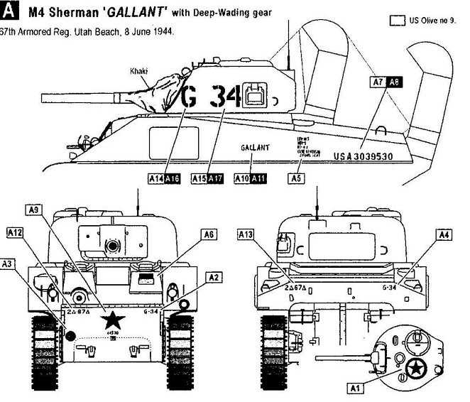 AD 67th AR G-34 GALLANT This particular vehicle was a Pullman tank, with the cast pointed transmission cover, no pistol port and the fender horn. The third speed number (on the bustle) is missing. This tank was part of the 66th AR (and NOT the 67th AR as mentioned in the instructions) as visible on the other tank of the same films sequence (on Criticalpast). |