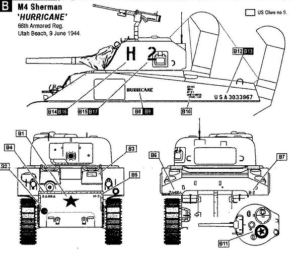 TB HQ-13 ALLIGATOR I think this is the most controversial tank in this set: in the only three stills I’ve seen of it (on British Pathè), it seems to be a PSC tank with the cast-in armour thickening hull and the pistol port, cast-in armour thickening and loader hatch turret (low bustle). If so, it shouldn’t have appliqué armour. The tank was far from the cameramen and the images are not as clear as I’d like, but I hope to be in the right. Unfortunately the serial and the name are not readably. If I’m right about the photos and my counts, the serial numbers should lie in the batch from 3069997 to 3070396. The suggested 3036589 is right for a M4A1 of a former PSC batch. Furthermore, as far as I’ve found, the large white numbers on the wading trunk were typical for the 741st TB, while the tanks of the 743rd TB had the individual numbers on the turret sides. After a long agony, I decided to follow my interpretation and my model was made as the 741st TB HQ-13, without the name and a fictional (but possible) serial. Should new evidence ever confirm my conjectures as wrong, a mud spot will miraculously drop on the bumper code, the tank will change identity and a name will appear on the hull sides. |