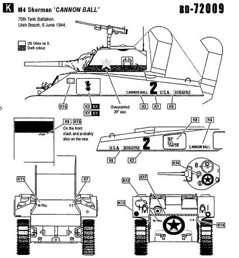 TB C-2 CANNON BALL This was an ALCO tank. In the two photos I’ve seen of this vehicle, the transmission cover is not visible. This subject is present in both the Dragon and UM decals, always associated to a cast transmission cover. However the serial 3066192 was the 208th tank of the 2nd batch and should be produced in April 1943. If I’m right it's highly possible it had a bolted transmission cover. For sure it had the pistol port (it had the appliqué armour on the right side and they are aligned) and the glacis horn. This tank had the attachment points for the rockets launcher on the turret. See here on Armorama or Missing-Lynx. |