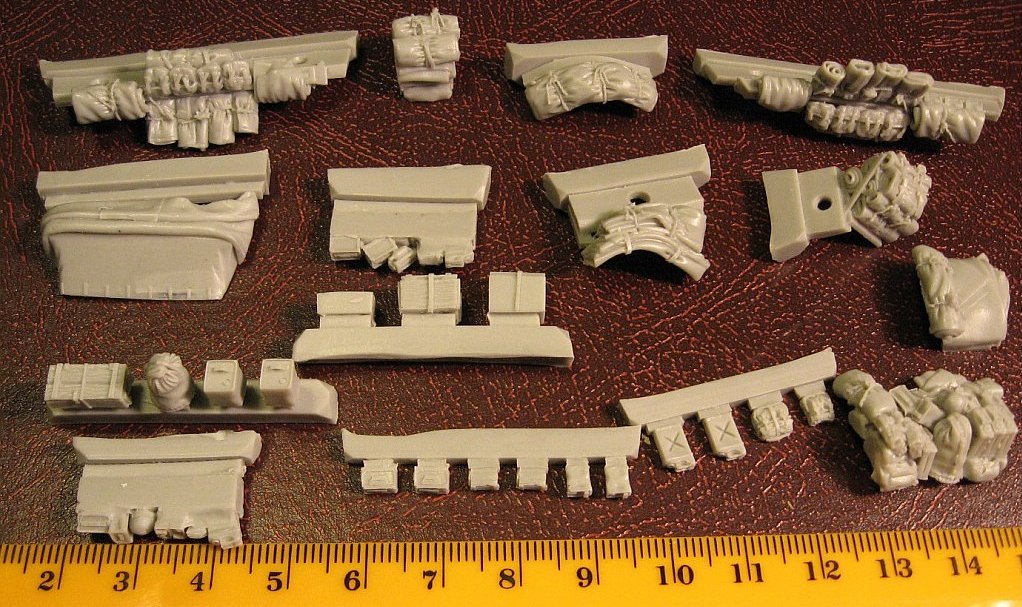 The Black dog resin is hard and light weight and may be molded in any color. My examples are green, light grey and dark grey. I have as yet to see any tan colored resin as the company portraits on their box tops. They seem to have also switched from a large box, 4 inches by 4 inches to a slightly smaller end-opening box that measures 4 inches by 3 inches. This set, for the Academy Halftrack and amphibian jeep (Academy kit no. 13408) has 28 pieces, some grouped together and others singly. In my opinion, some single parts look like they are from CMK or Goffy. |