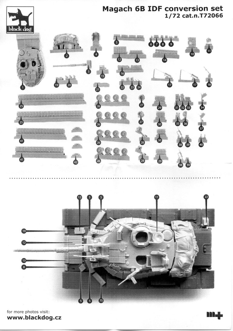 1. History The Magach 6B Gal is a further improvement over the original M60A1, taking into consideration the experience derived from the Peace for Galilee operation, when the IDF fielded many M60A1 in the Magach 6B Bet version. The Gal optical system was installed, which needed a new and larger armored housing in front of the commander's cupola; a thermal sleeve also was installed on the original main gun, and a crosswind sensor mast was positioned on the rear left hand of the turret's roof. Other changes include a large stowage basket in the rear of the turret and 7. 62mm MAGs replacing the original Browning MGs. A later modification is the installment of Merkava tracks and sprocket wheels. 2. Packaging The parts came in a cardboard box typical of Black Dog productions. Quality of resin and casting are also typical of Black Dog productions. 3. Parts This conversion set is intended for anyone wanting the build the 6B Gal starting from Revell M60A1/A3 kit. The turret itself is a one-block affair with every ERA block already in place, along with the Urdan Cupola, optical system with cover, lift rings and gun shield with cover. The old Esci M60 Blazer seem to have been used as a mine for parts, as the Urdan cupola derives from that kit (although the hatch is separate and can be mounted open). The ERA blocks are entirely scratchbuilt (not the ESCI ones) and look very nice, with the typical "box-like" look on show. The large stowage basket full with equipment is built in one block too with exceptional detail. Earlier aluminium wheels to replace the Revell steel wheels are supplied, as well as Merkava tracks and sprocket wheels. The early-style aluminium wheels look like ESCI copies, so they are far from being perfect yet they do look sufficient. These kind of wheels have been progressively substituted by the later-style steel wheels (the ones supplied by Revell), so that the majority of Merkava 6B Gal show steel wheels, or even a combination of both. Aluminium idler wheels are supplied with some Merkava track links in place, so this looks like a forced choice if the supplied Merkava tracks are to be used. However, any combination is possible between aluminium and steel wheels, original sprockets/tracks and Merkava sprockets/tracks. Original tracks are the ones with octagonal rubber blocks, supplied both by ESCI and Revell (the later are obviously much better, with inner details and guide horns). Other pieces are a new gun with thermal sleeve, the additional ERA blocks to be positioned on the glacis and around the gun, as well as important details like the MAG MGs, a combination of twin 12.7 Browning MGs with ammunition, the lateral 60mm mortar operated by the commander, the smoke grenade dischargers and a folded stretcher to be secured to the left front fender. A welcome addiction is the instructor's chair behind the loader's hatch, which was only mounted during training sessions but it is good to see it included nonetheless. 4. Instructions Two photocopied pages are supplied detailing the whole lot of pieces with photos showing where to place them. 4. Accuracy The crosswind sensor mast, which is typical of Magach 6B Gal, is sadly missing, as are some other bits and pieces which should be added, such as three rings on the Urdan cupola, a support for ammo boxes and a container for commander's personal belongings, the latter two to be positioned on the rear section of turret roof. Another inaccuracy is not Black Dog's fault. Air filters in Revell upper hull are molded in-place and can not be replaced without seriously damaging the piece, while they should be because they are the later-type top-loading filters, while every IDF M60A1 has the earlier-type side-loading filters. This means that the Revell M60 hull can not be used to reproduce a Magach 6. 5. Conclusions This conversion set is an absolute must for anyone interested in IDF vehicles, provided that he accepts the fact that these resin sets require a good deal of work and additions to obtain the desired result, which can be fantastic. Unfortunately, Revell M60 is not a good starting point because it reproduces a later vehicle. The old Esci M60 would be a better choice, but it is OOP and never re-released, moreover it has some faults which are detailed here and need some extra work. Sample kit bought by author. |